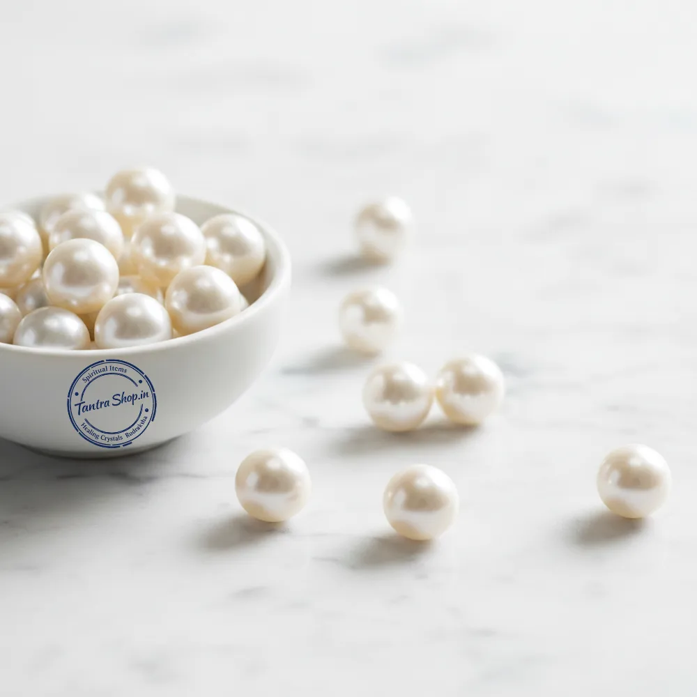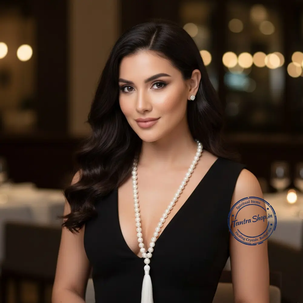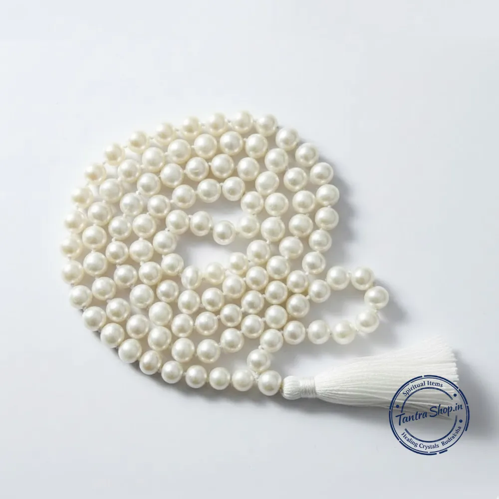 An energized pearl mala undergoes traditional activation processes using sound, intention, and disciplined methods to enhance its natural vibrational responsiveness. Energization does not alter the physical composition of the pearl but is performed to align the mala for immediate use with focused intention. When worn consistently or used during mantra recitation, meditation, or daily routines, the mala is traditionally associated with emotional steadiness, self-control, refined speech, and inner grace.