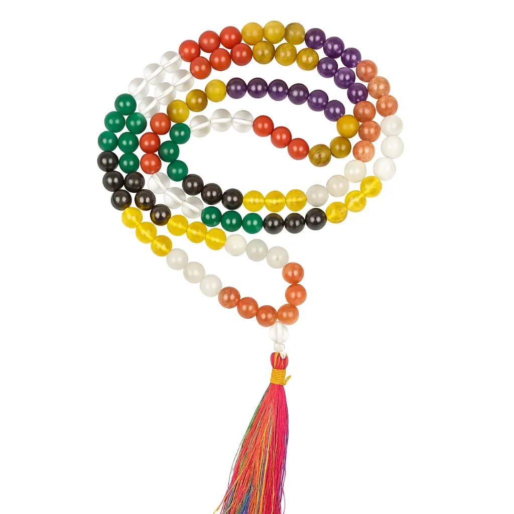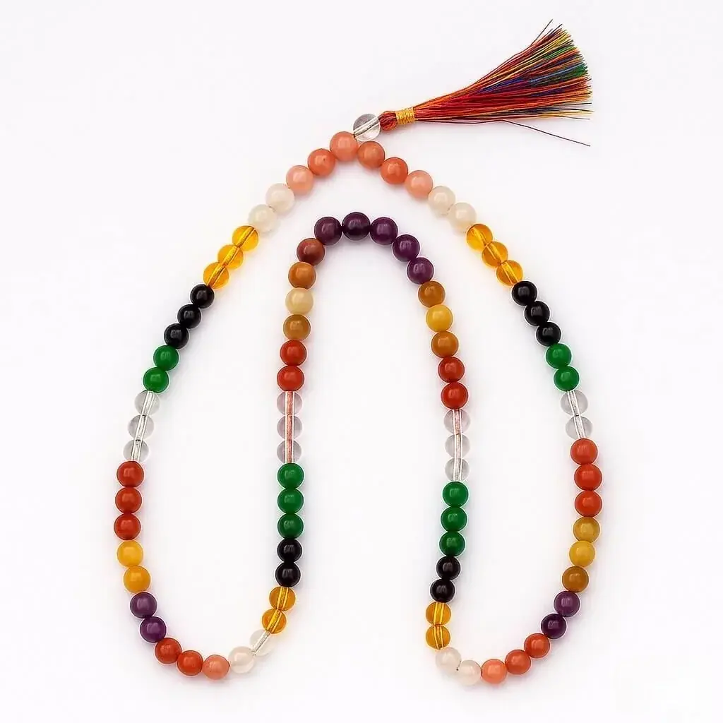 Natural Navgrah Crystal Mala is traditionally regarded as a holistic astrological tool designed to harmonize the energies of all nine planets simultaneously. Each bead represents planetary influence and is believed to work collectively to balance karmic patterns, enhance inner stability, and promote overall well-being. The sacred count of 108+1 beads aligns with traditional japa and meditation practices, making the mala suitable for mantra chanting, spiritual focus, and daily wear. The crystals are considered natural energy conductors, traditionally believed to absorb negativity and support clarity, discipline, wisdom, emotional balance, prosperity, and protection.