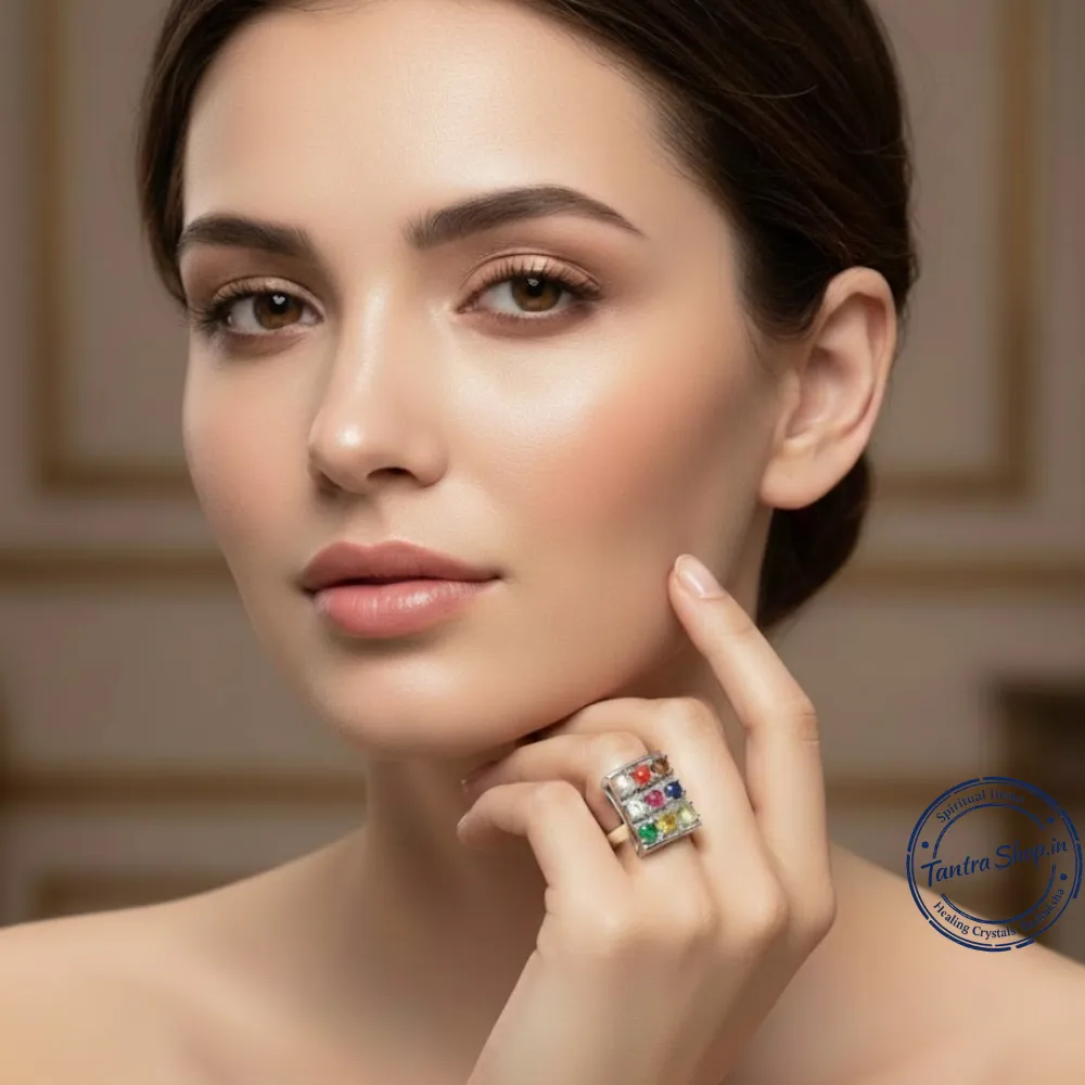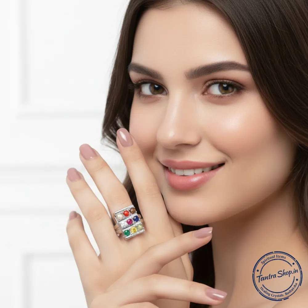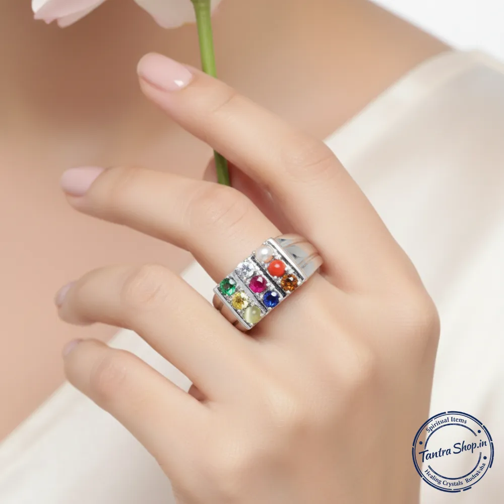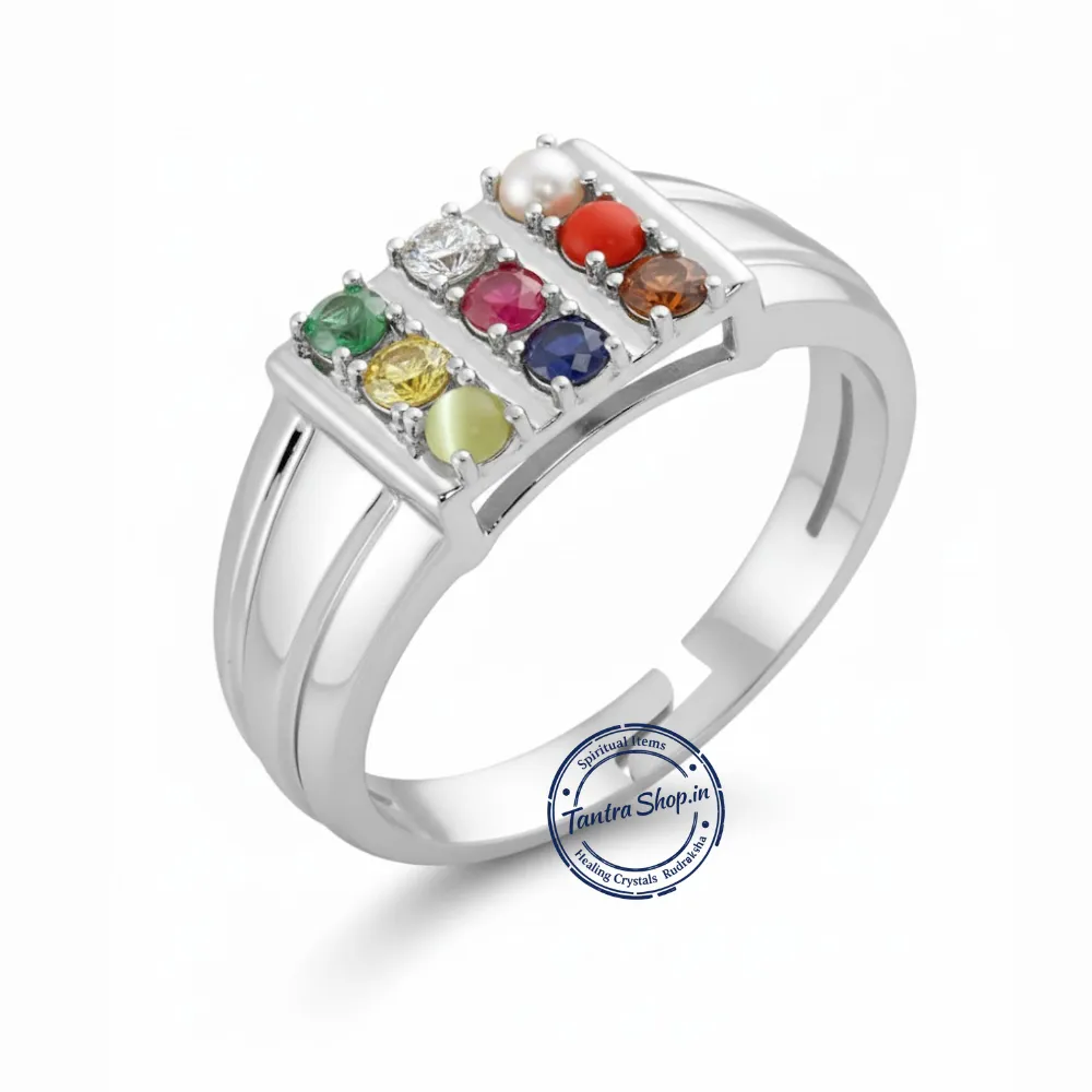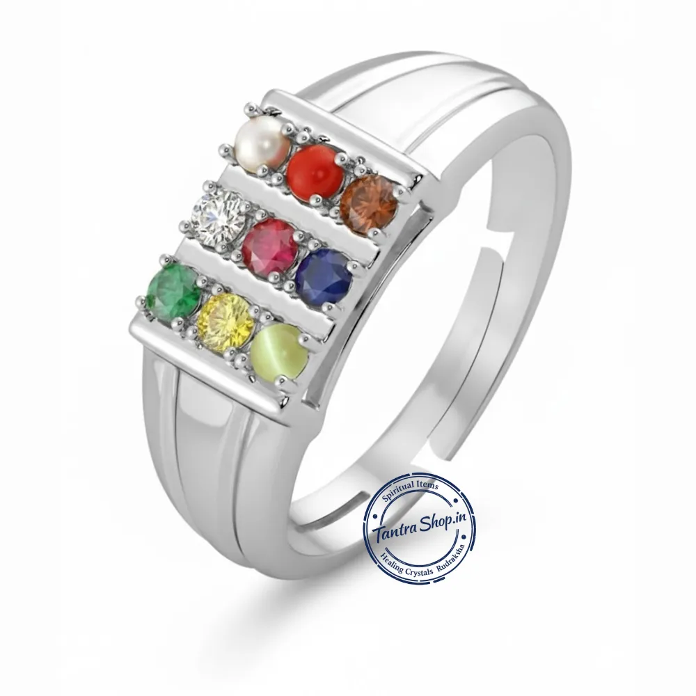 The ring is traditionally worn with a positive intention and faith, as its benefits are rooted in Vedic astrology, spiritual belief systems, and centuries-old practices, not modern medical or scientific claims. This energized Navratna Silver Ring is therefore not just jewelry, but a symbolic spiritual tool believed to harmonize planetary energies, promote peace, and support both material and spiritual growth when worn with श्रद्धा, विश्वास और सकारात्मक संकल्प। Buy Natural Navratna Navgraha Stone Silver Ring (Adjustable, Unisex). Energized & certified ring for 9 planet balance, success, protection & prosperity.